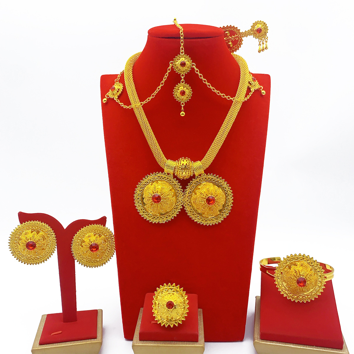 24k Gold Faux Gold Wedding Jewelry Set Dubai India Nigeria Bride Necklace Earrings Bracelet Ring