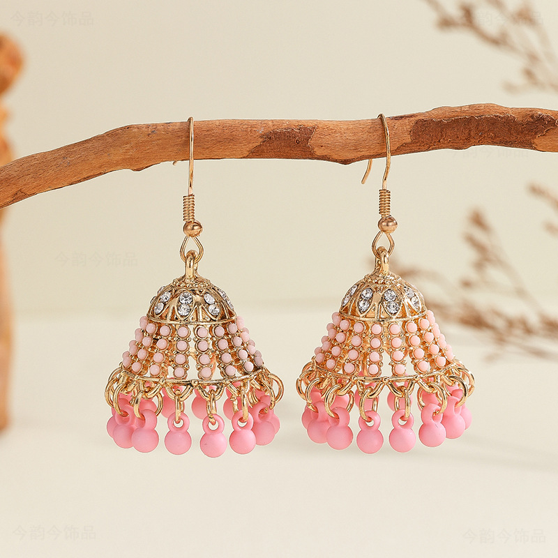 Cross-Border Indian Ethnic Style Inlaid Rice Beads Rhinestone Earrings Bird Cage Bell Pendant Pink European and American Retro Indian and Pakistani Style
