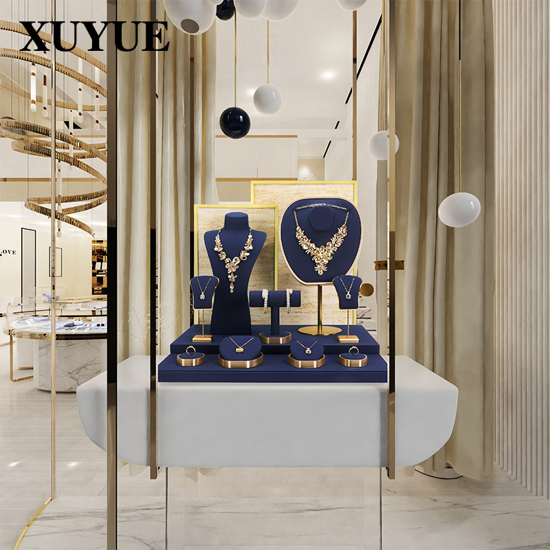 Xuyue Window Jewelry Display Props Blue Microfiber Ladder Jewelry Display Stand Necklace Ring Earrings Display Stand
