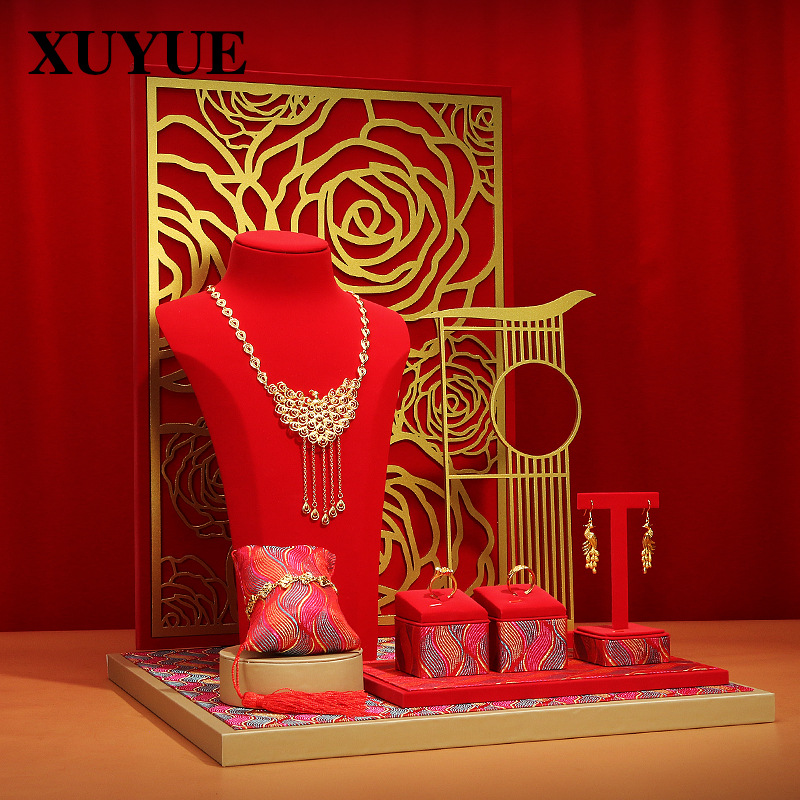 New gold window props Red jewelry display stand ancient gold earrings necklace display counter jewelry