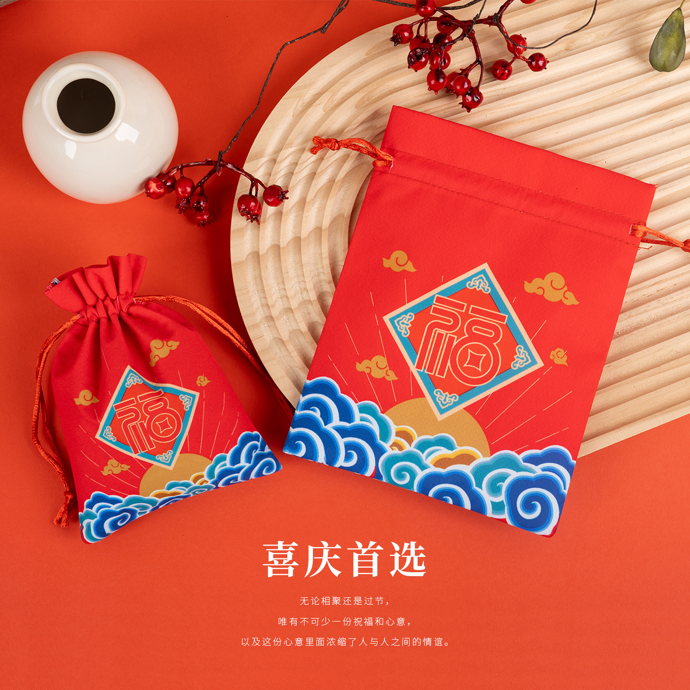 Ancient Style Jewelry Drawstring Bag with Blessing Character, Brocade Pouch for Storing Cultural and Artistic Items, Jewelry, and Gifts