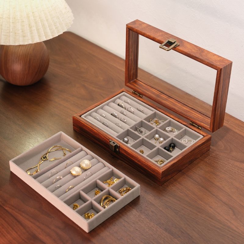 Walnut Wood Grain Jewelry Storage Box Transparent Dust-Proof Large-Capacity High-End Exquisite Anti-Oxidation Jewelry Earrings Jewelry Box