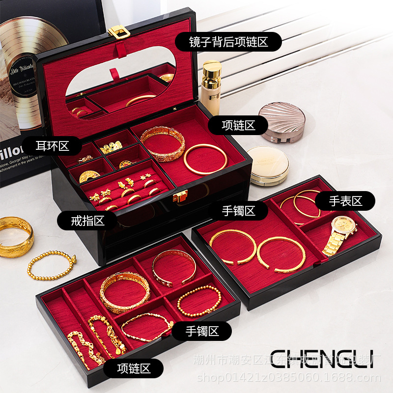 In-Stock Traditional Gold Jewelry Box with Multiple Layers, Piano Lacquer Drawer Storage Box, Large Capacity Anti-Oxidation Jewelry Case