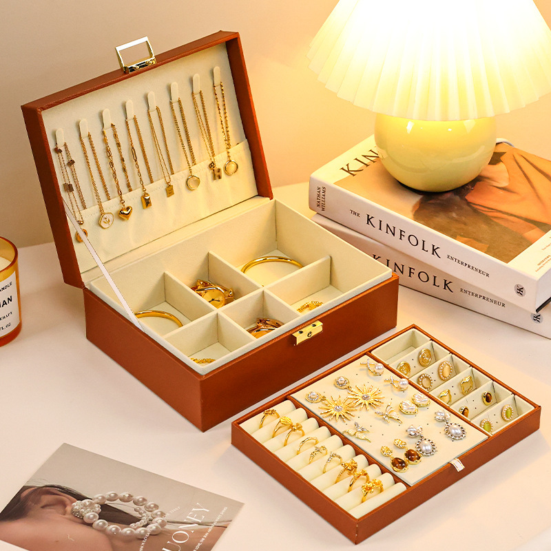 Anti-oxidation high-grade leather jewelry box jewelry bracelet earrings rings necklace three gold makeup storage bag