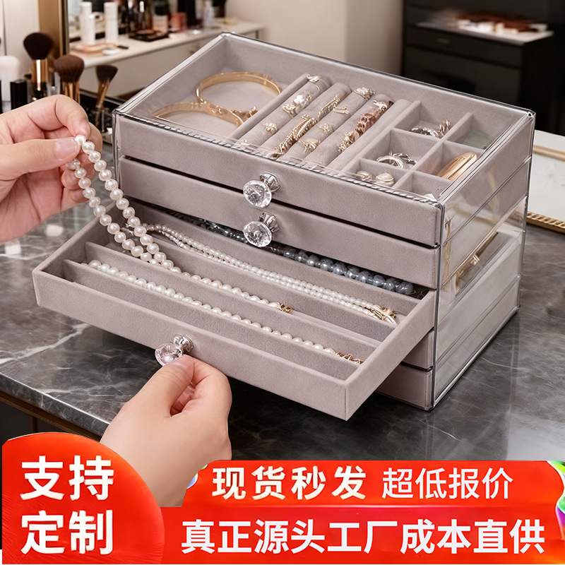 Jewelry Box Multi-Layer Necklace Ring Bracelet Earring Storage Box Anti-Oxidation Velvet Pull-Out Moisture-Proof and Dust-Proof Ready Stock
