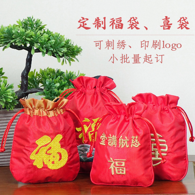 Red Drawstring Pouch with the Character for Fortune, Traditional Chinese Style Silk Satin Jewelry Bag, Custom-Made