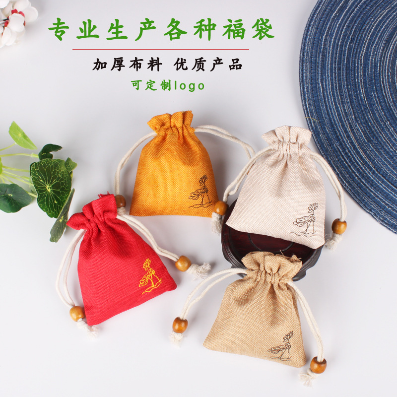 Cotton and linen cloth bag bundle mouth brocade bag Buddha beads lucky bag hand string storage bag text play jewelry bundle mouth 10*14