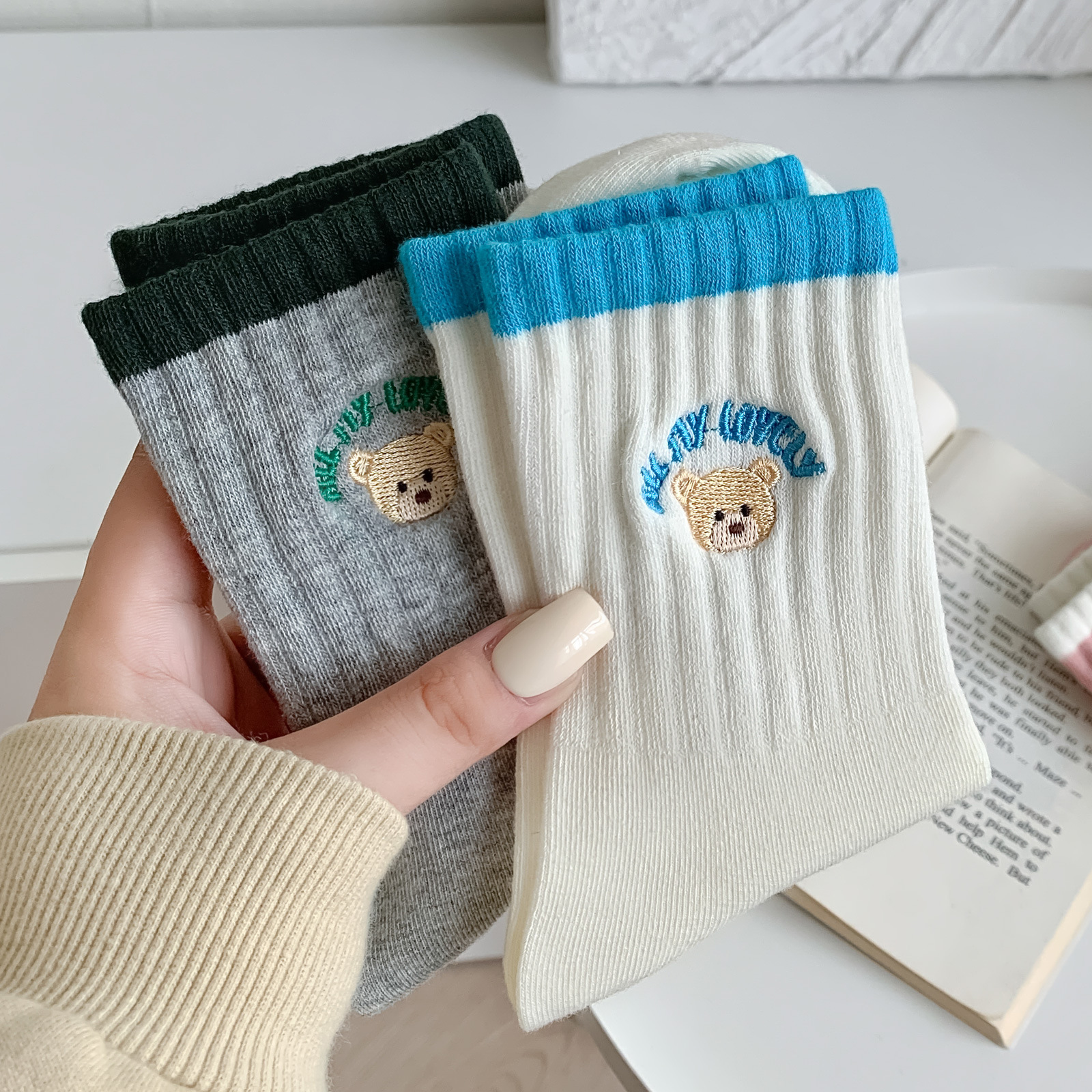Women's Socks for Autumn and Winter, Mid-Calf Cotton Socks with Embroidered Bears, Versatile Casual Socks, Skin-Friendly and Breathable, Women's Socks Wholesale from Zhuji