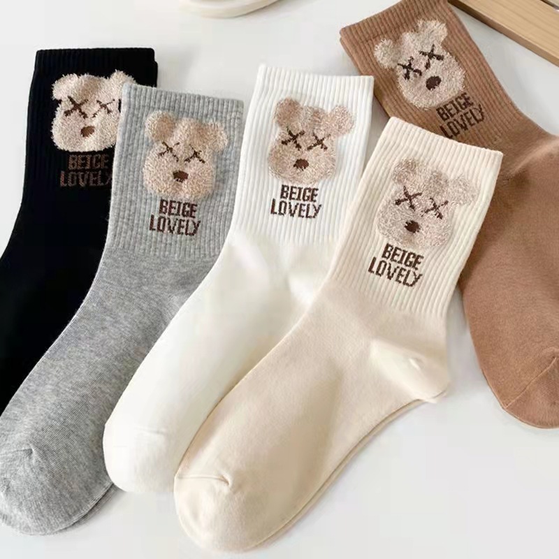 Autumn and Winter Bear Mid-Calf Socks, Pure Cotton, Comfortable, Trendyy, Versatile, Simple, Skin-Friendly, Breathable, Sweat-Absorbent, Cute Bear, All Year Round Style