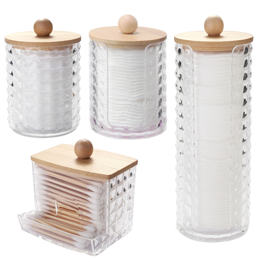 Diamond Pattern Cotton Swab Storage Box Bamboo Cover Acrylic Portable Round Container Cosmetic Cotton Powder Puff Storage Box
