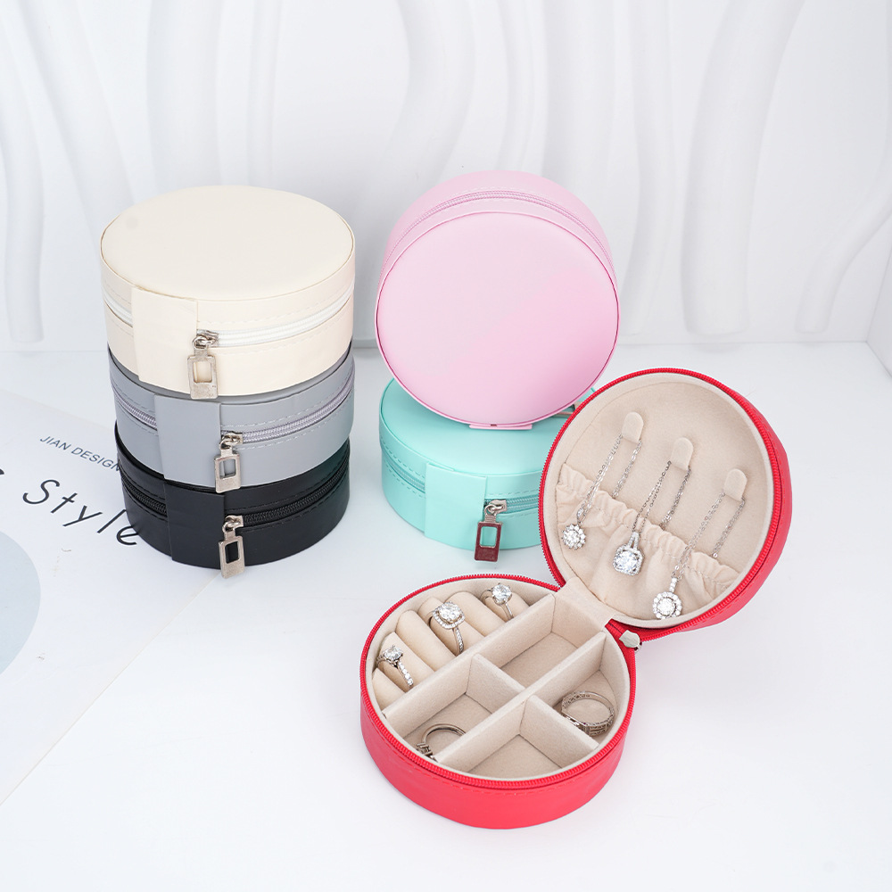 Pu Leather Round Zipper Bag Portable Jewelry Box Travel Mini Jewelry Storage Box Pendant Necklace Box Ready for Sale