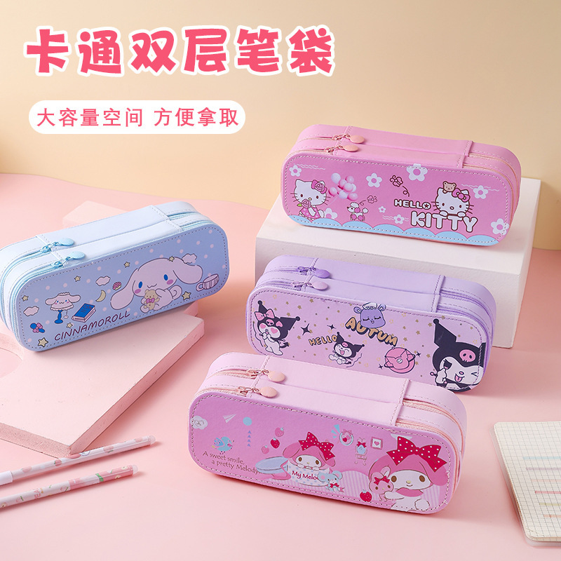 Double-Layer Large-Capacity Pencil Case Kuromi Cinnamon Dog Melody Kt Cat Stationery Box for Girls Primary School Students Cute