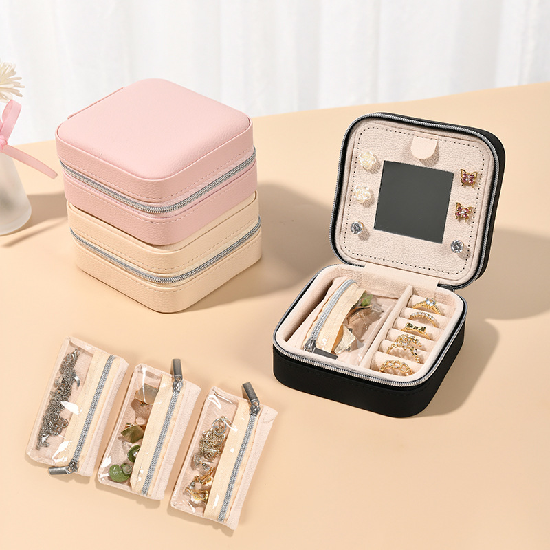 Casual Hand Jewelry Box, Portable Mirror Cosmetics Bag, Travel Ring Mini Zipper Jewelry Storage Box