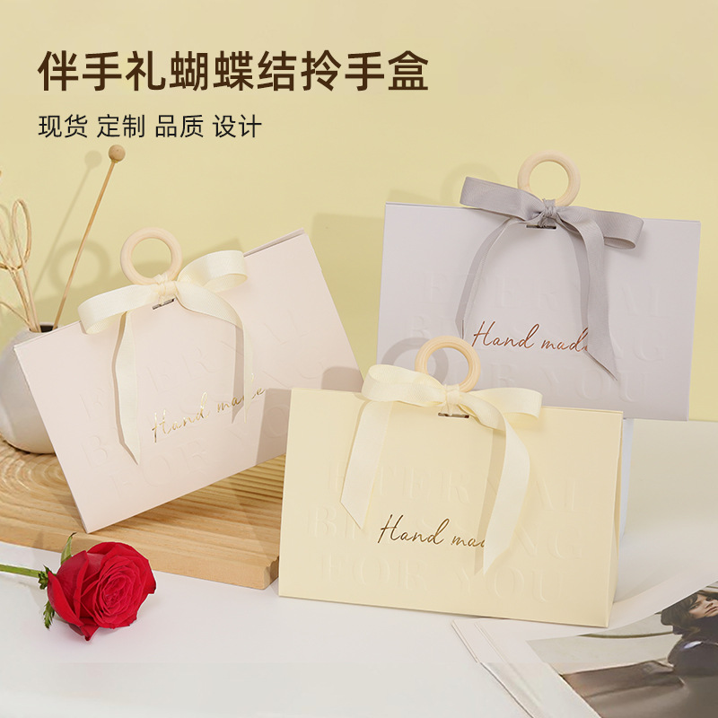 Ready-Made Wedding Accompaniment Gift Box, Light Luxury Wooden Ring Ribbon Hand-Held Gift Bag, High-End Wedding Candy Snack Hand Bag