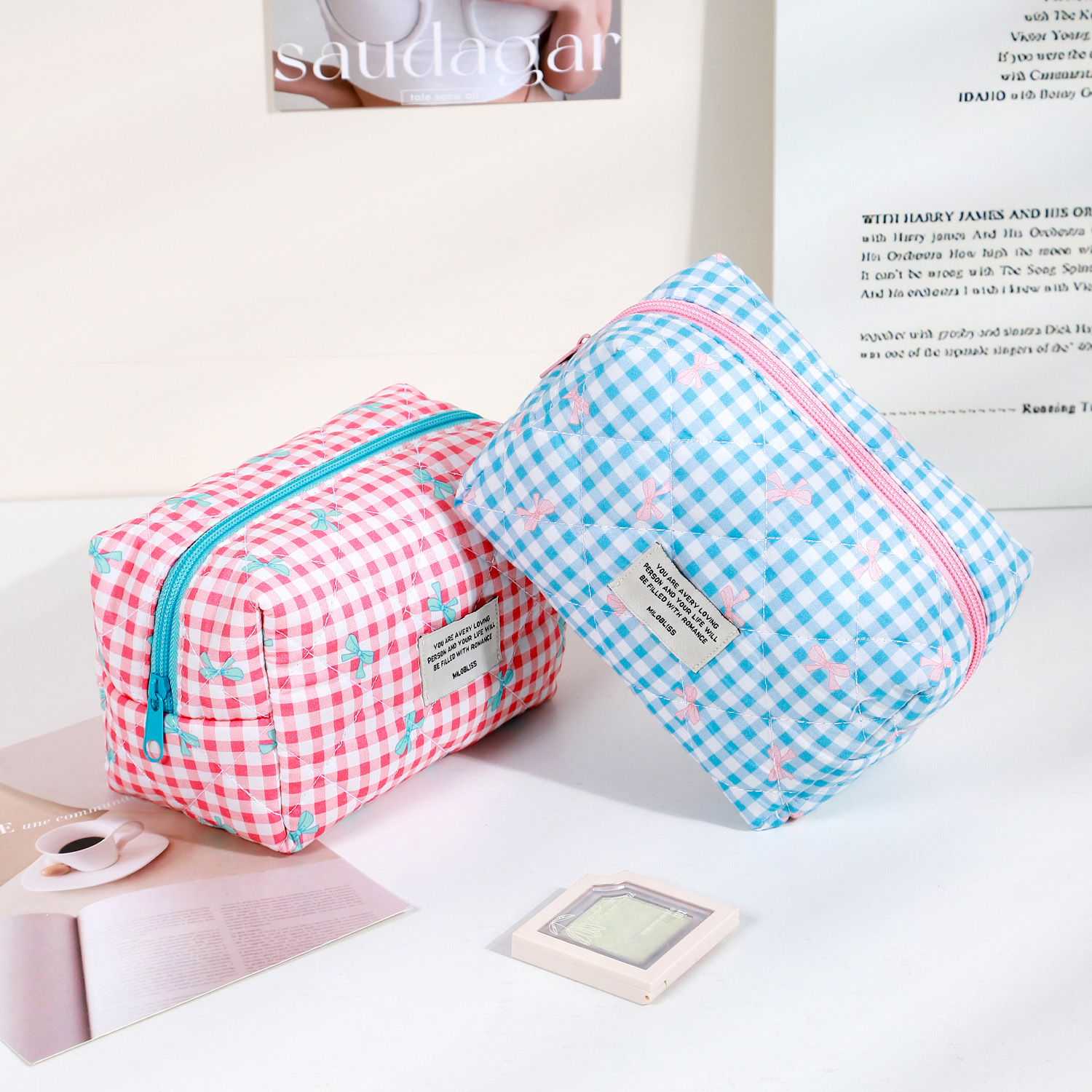 Bowknot Cute Cosmetic Bag Cross-border Plaid Pillow Bag Large Capacity High-end Storage Bag Women's Wash Bag Pencil Bag