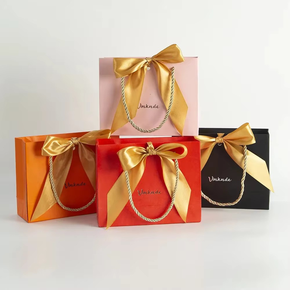Paper Bag Customized Wedding Birthday Party Portable Wrapping Paper Bag Jewelry Box Gift Bag with Gold Bow Silk