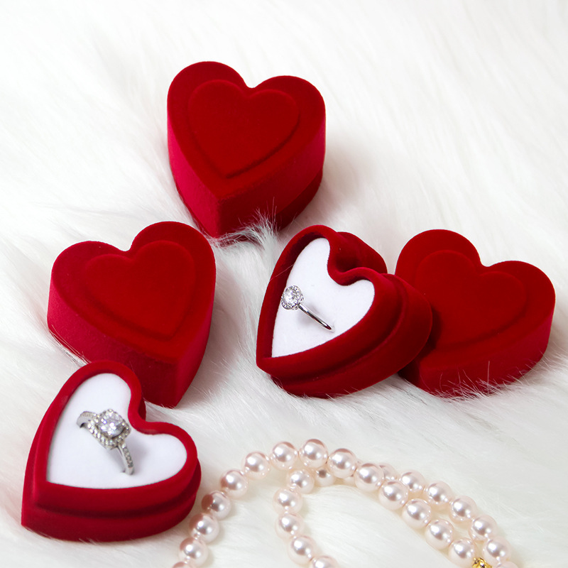 High-End Ring Box with Lid, Red Flocked Jewelry Box, Storage Box, High-End Heart Ring and Earring Storage Box