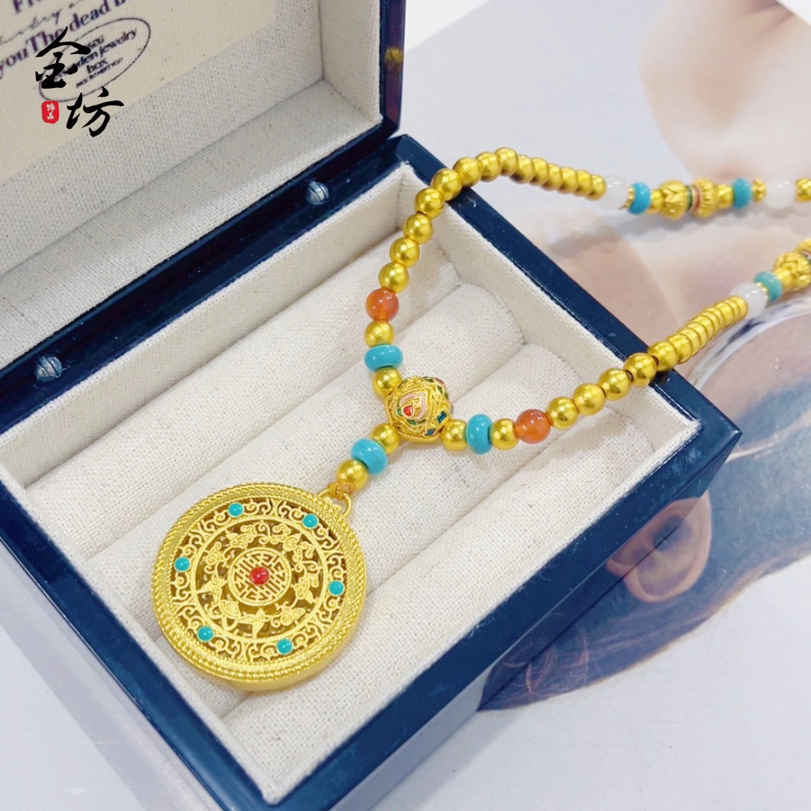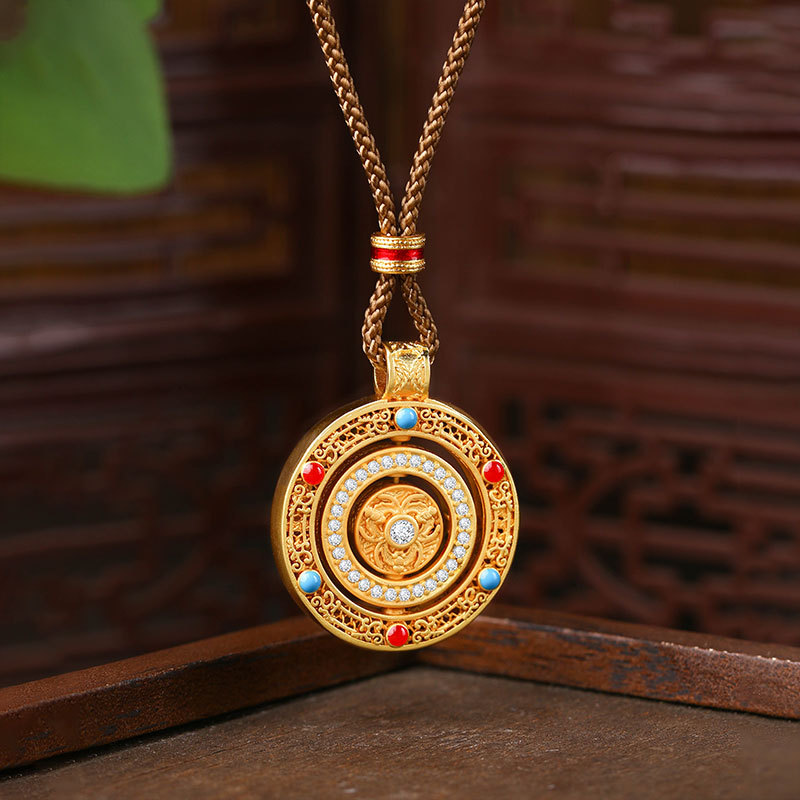 Tiktok Hot Selling Wei Xue Style Sand Gold Ancient Inlay Red and Green Fortune Rotating Disc Pendant Necklace for Women