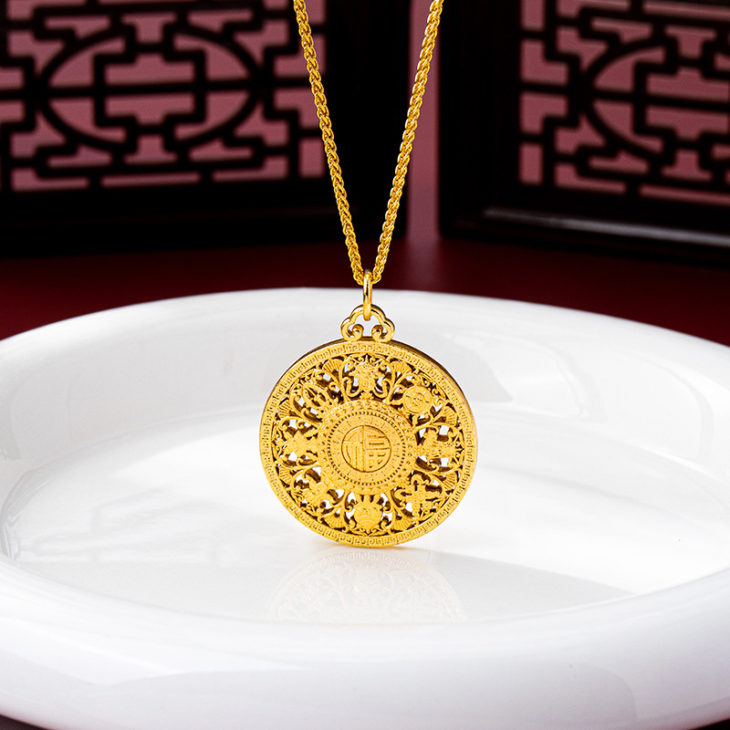 Puzuo Gold Shop's Same Style Sand Gold Fortune Character Eight Auspicious Necklace New Chinese Style Hollow Disc Pendant Sweater Chain
