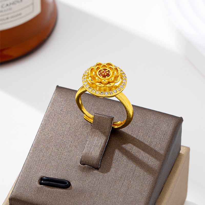 New Chinese Style Disc Lotus Inlaid Zirconium Ring for Women Vietnamese Sand Gold Ethnic Style Index Finger Ring with Long-Lasting Elegant and Non-Fading Jewelry