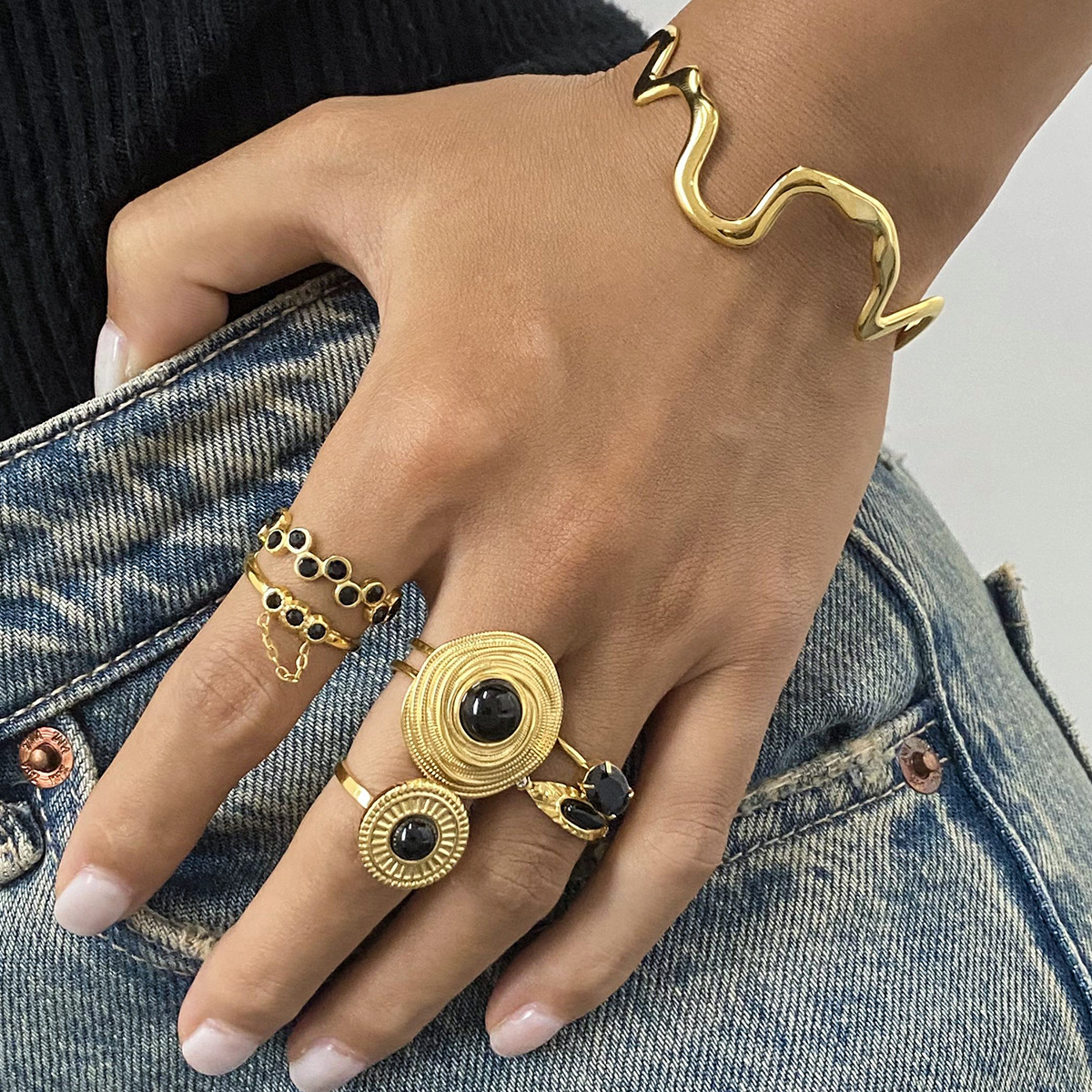 High-End European and American Style Stainless Steel Ring with Button Disc, Black Agate Adjustable Ring, Titanium Steel That Does Not Fade