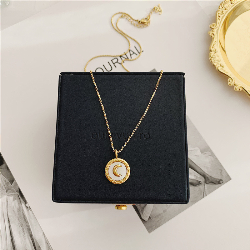Korean Fashion Personalized European and American ins Cold Style Retro Disc White Fritillaria Moon Titanium Steel Necklace Women's Woolen Chain