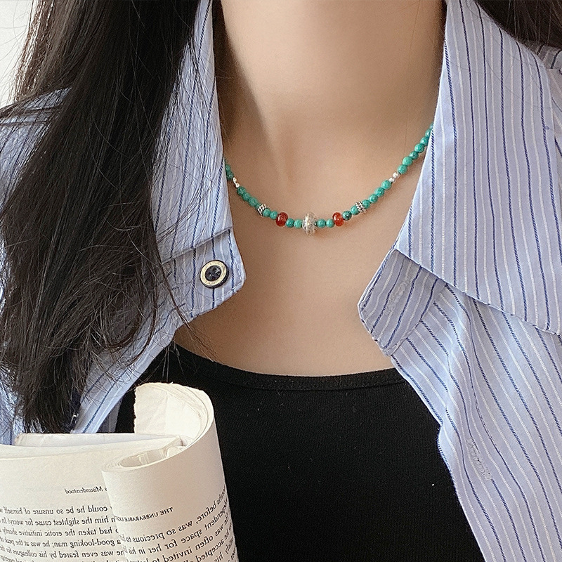 925 sterling silver synthetic turquoise disc necklace handmade beaded fashion retro ethnic style temperament clavicle chain N1179