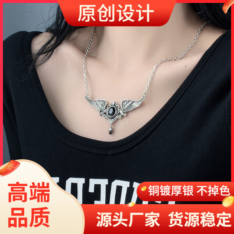 Angel Devil Wings Necklace Ins Vintage Disc Crown Pendant Copper Plated Thai Silver Woolen Chain Trendy Fashion
