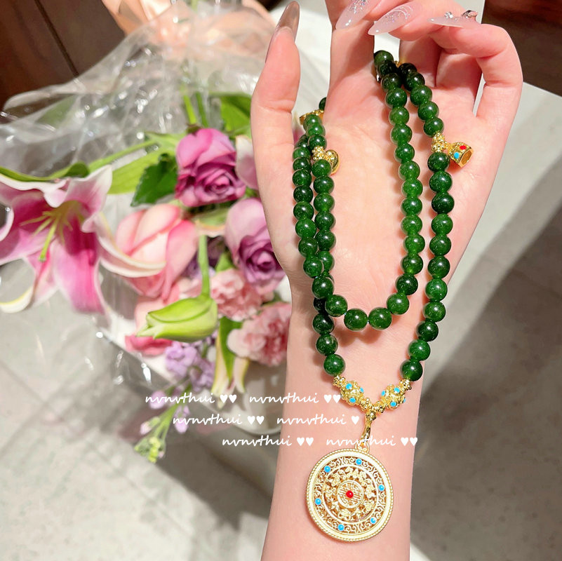 Brazil green chalcedony agate beads necklace antique plated 18K gold woven carved gold disc zircon Jade sweater chain