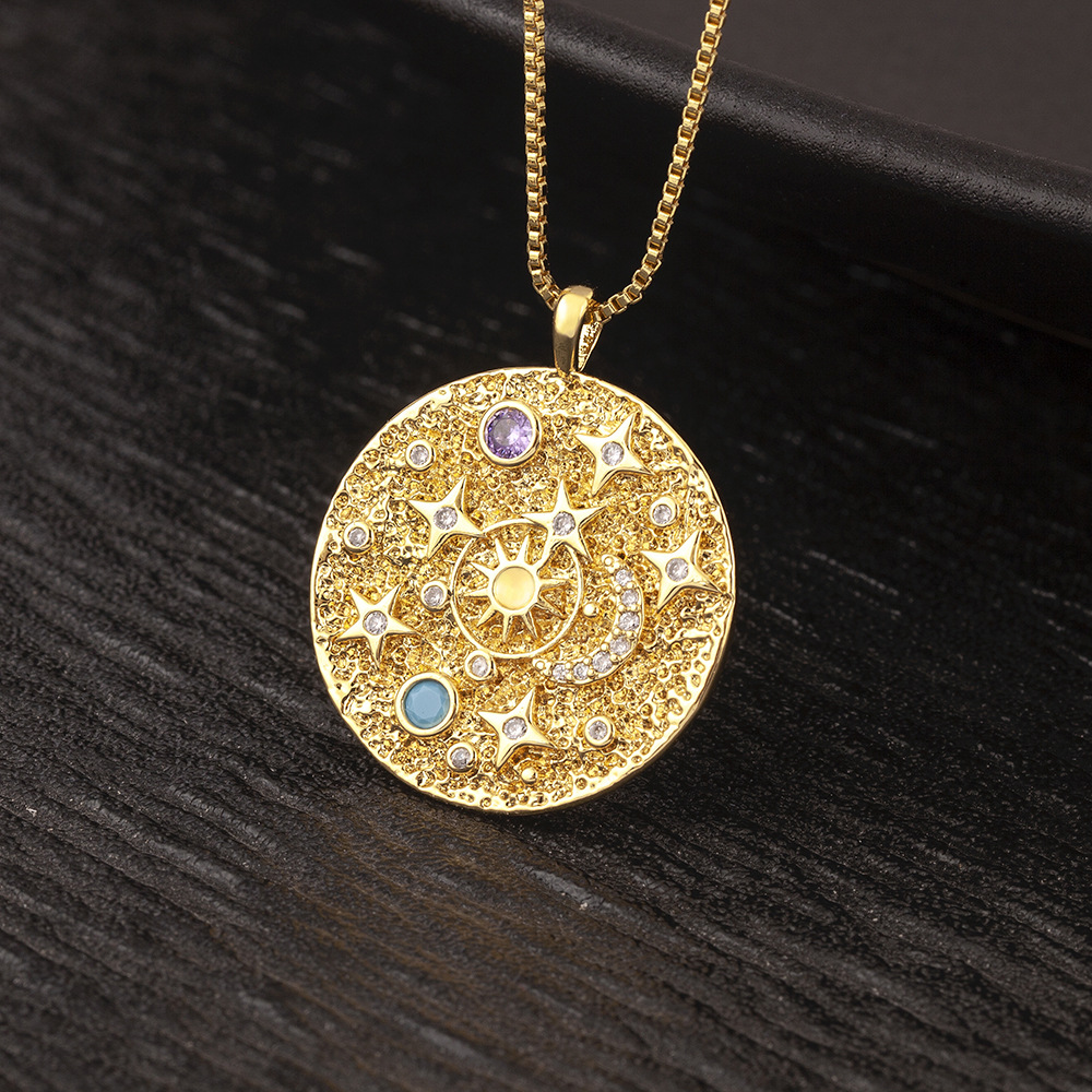 Copper-Plated 18K Real Gold Zircon Sun Star Moon Round Disc Design Simple Niche Pendant Necklace Export