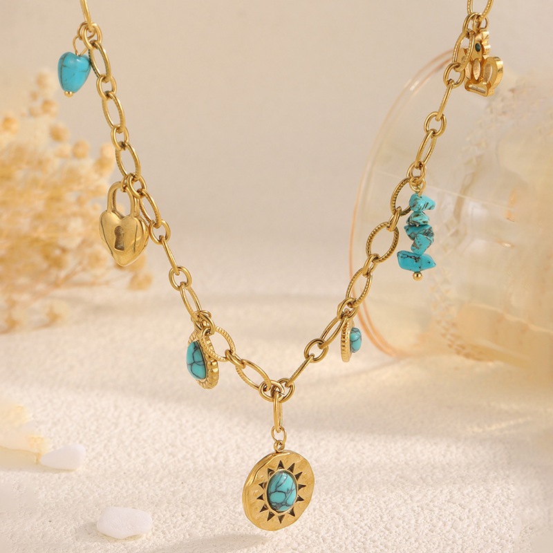 Fashionable New Titanium Steel Necklace for Women, Versatile and Non-Fading, Blue Turquoise Disc Sun Pendant, Niche Stainless Steel Jewelry