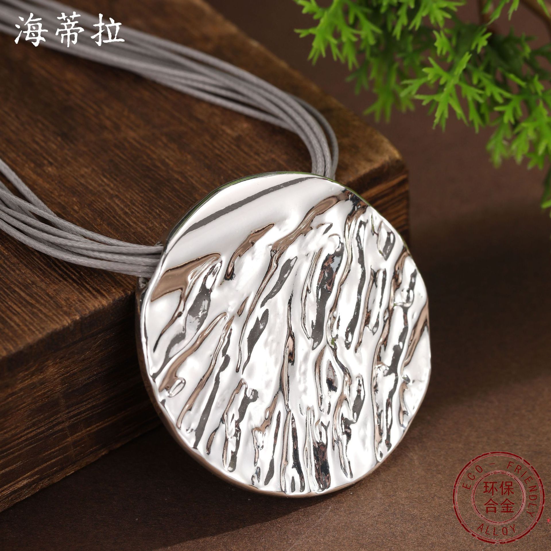 Cross-Border New Style Glossy Asymmetrical Disc Leather Rope Magnetic Necklace Women's Creative Exaggerated Disc Pendant