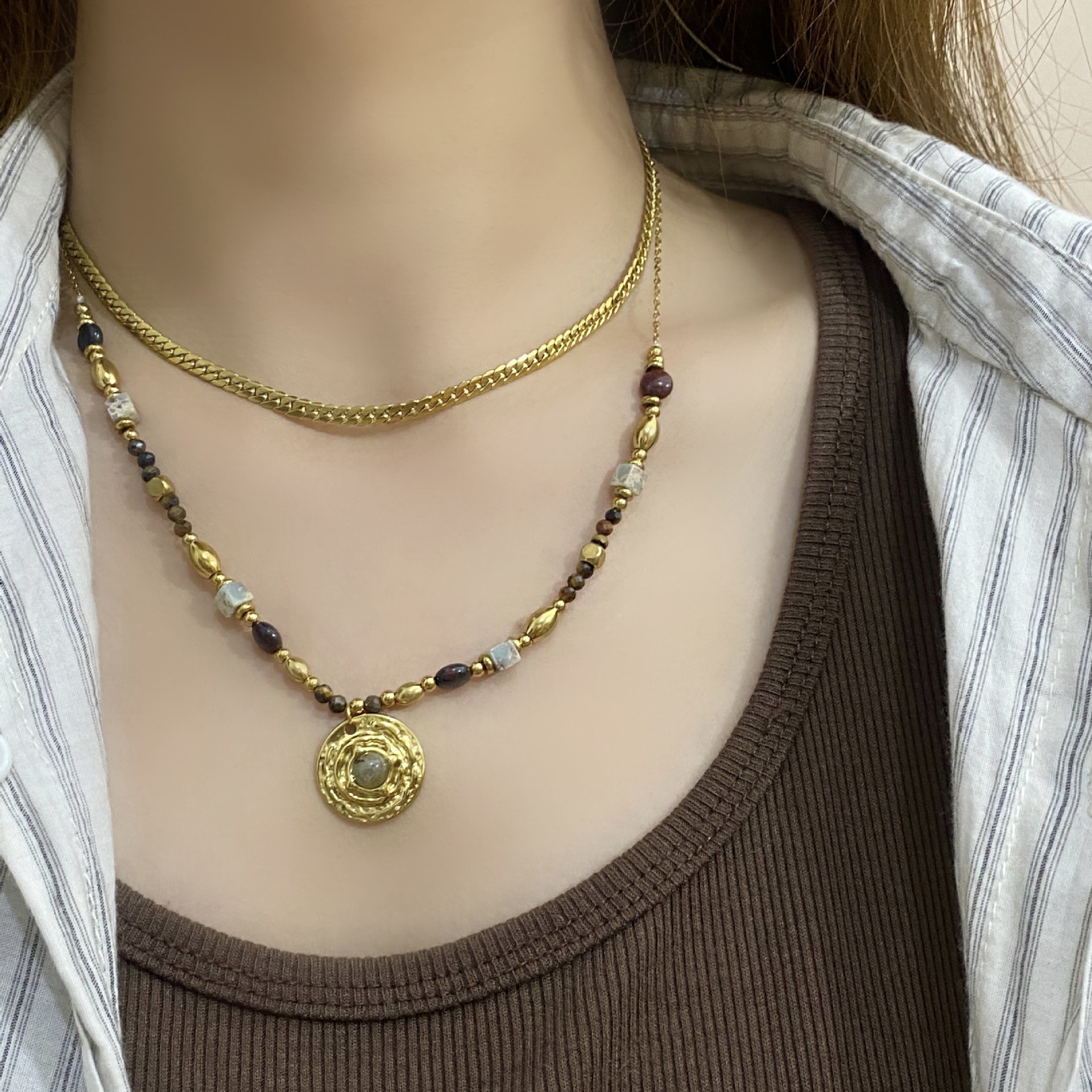 Medieval Style Tiger Eye Stone Shell Splicing Beaded Necklace Retro Light Luxury Disc Pendant Clavicle Chain Sweater Chain