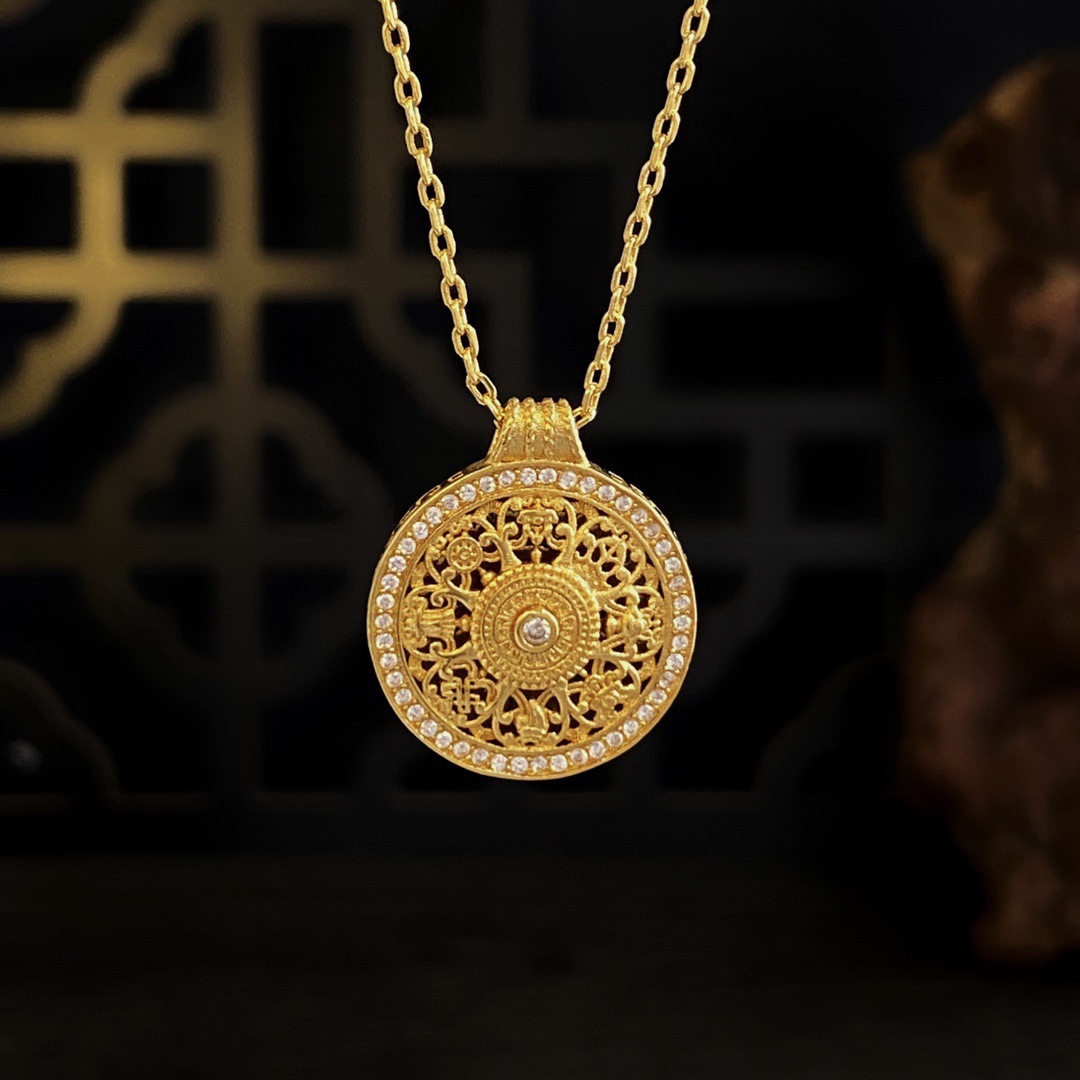 Xiaohongshu's Popular Ancient Enamel Filigree Eight-Treasure Compass Four-In-One Ruyi Sweater Chain Sand Gold Heavy Industry Disc Necklace
