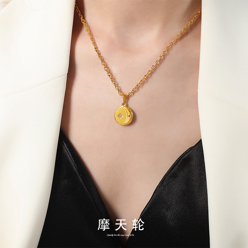 Korean style elegant personality fashion simple jewelry Star Moon disc inlaid zircon design pendant titanium steel gold plated necklace