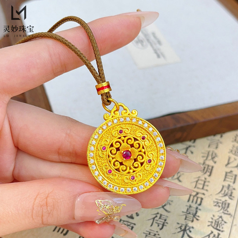 Wei Xue with the new Chinese ancient gold rose red diamond filigree wishful disc pendant necklace compass sweater chain
