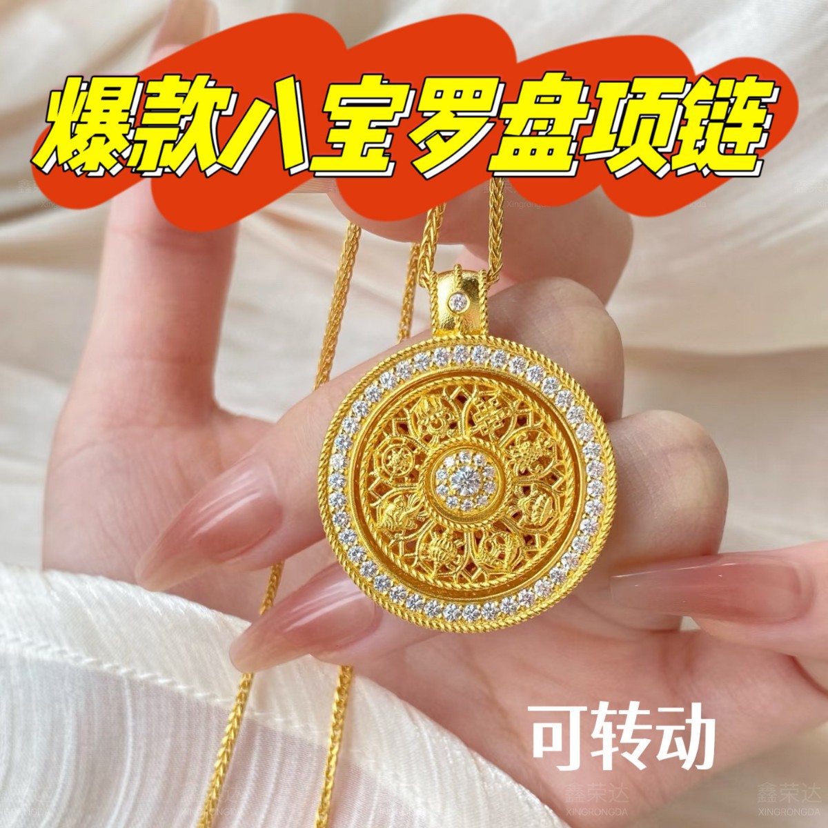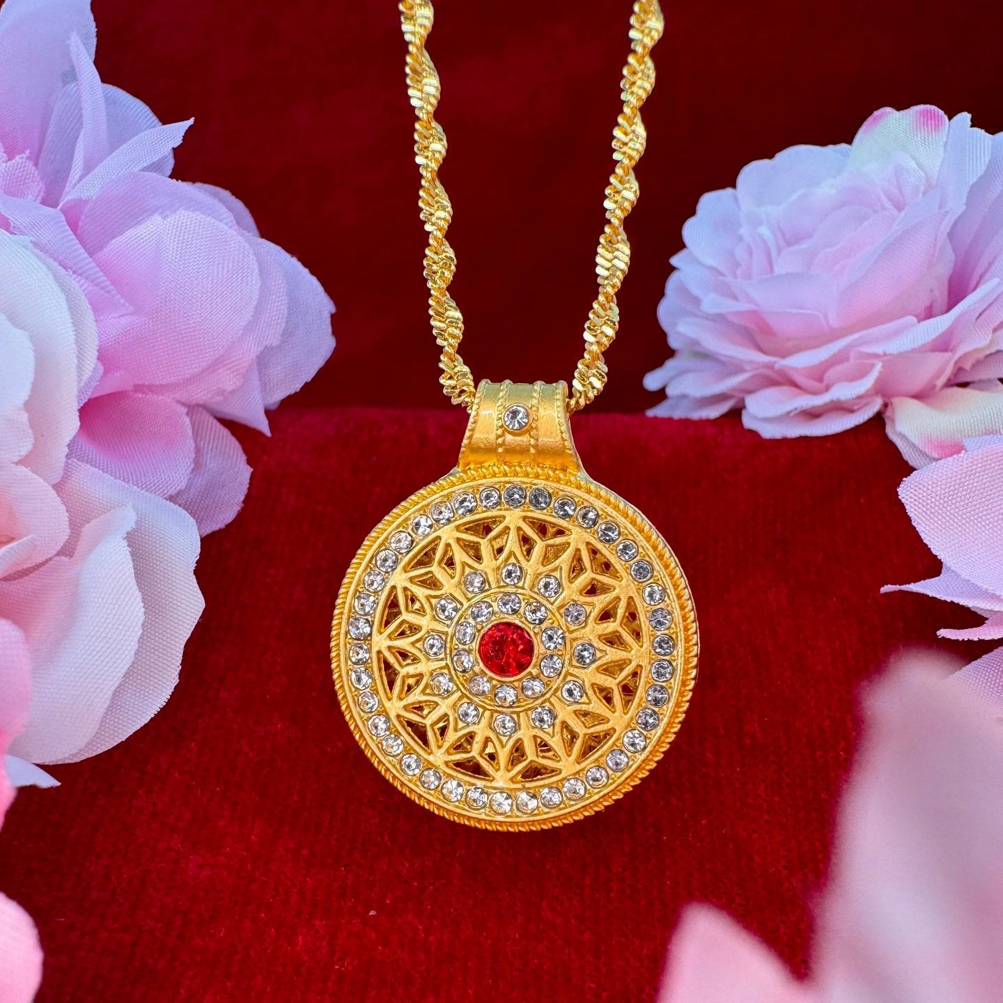 [Accepting Dropshipping] Vietnamese Sand Gold Hollow Filigree Diamond-Encrusted Rose Compass Pendant Accessory Round Disc Clavicle Chain