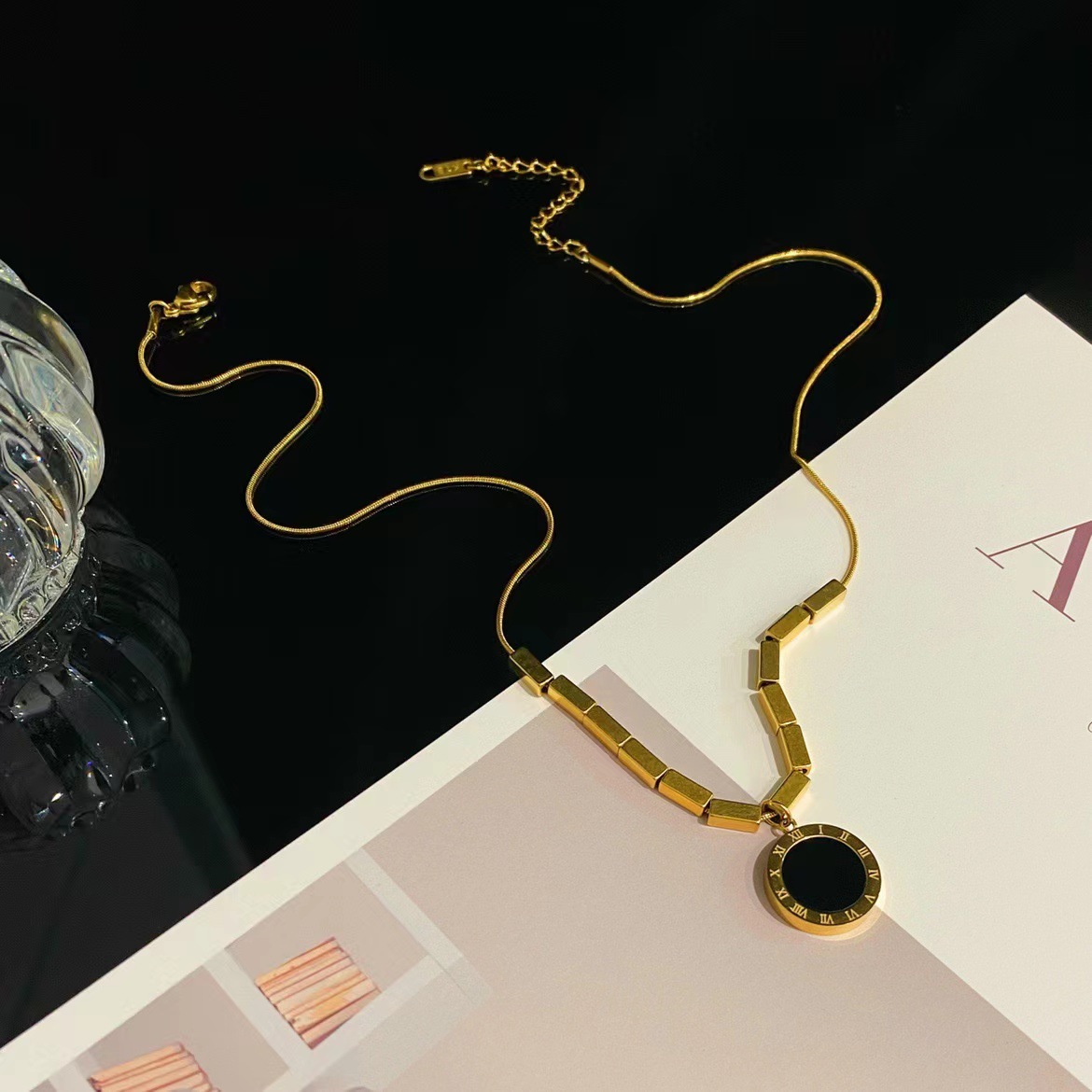 Baojia Roman digital V gold necklace female rose gold net red black white shell double-sided disc Korean fashion clavicle chain