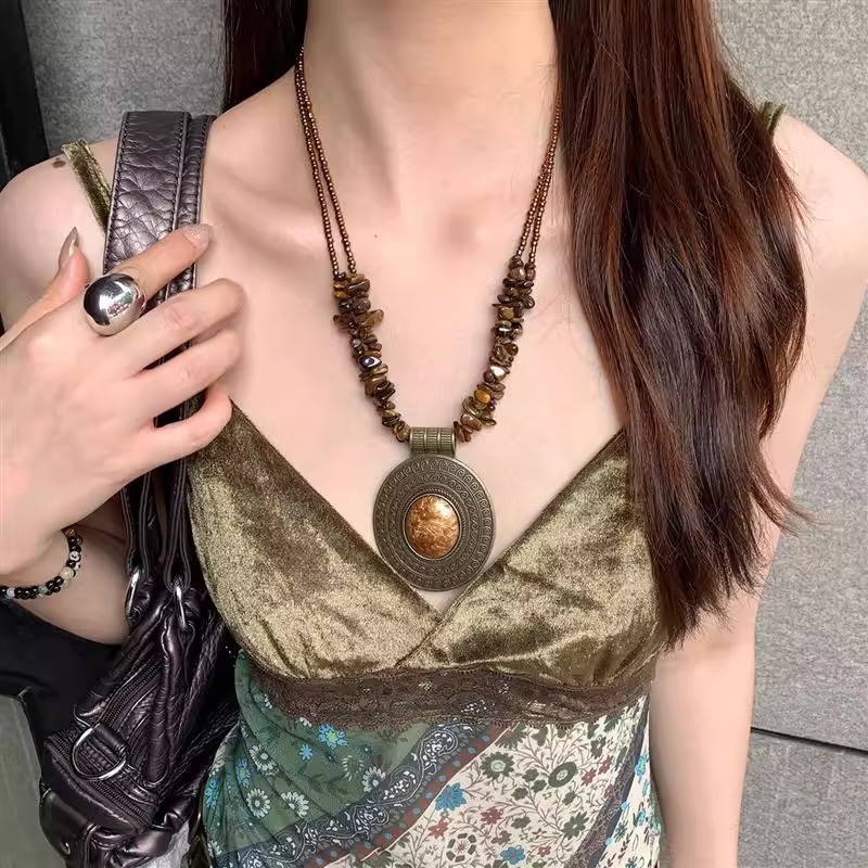Vintage Heavy Craft Turquoise Beaded Disc Pendant Necklace for Women Bohemian Ethnic Style Carved Clavicle Chain Necklace Trend