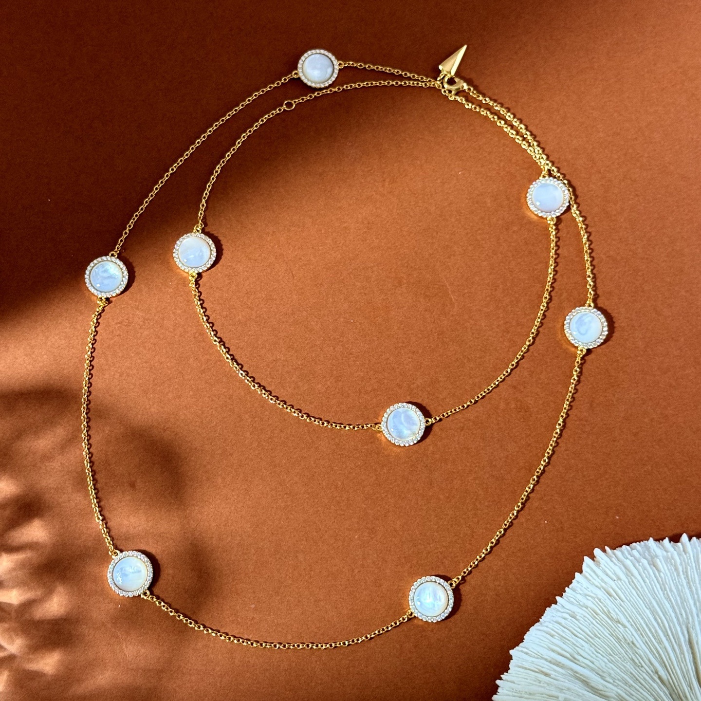 Exquisite and Elegant Eight Round Pearls and Zircons Inlaid with Curved Natural White Shell Discs 8 Flower Sweater Chain