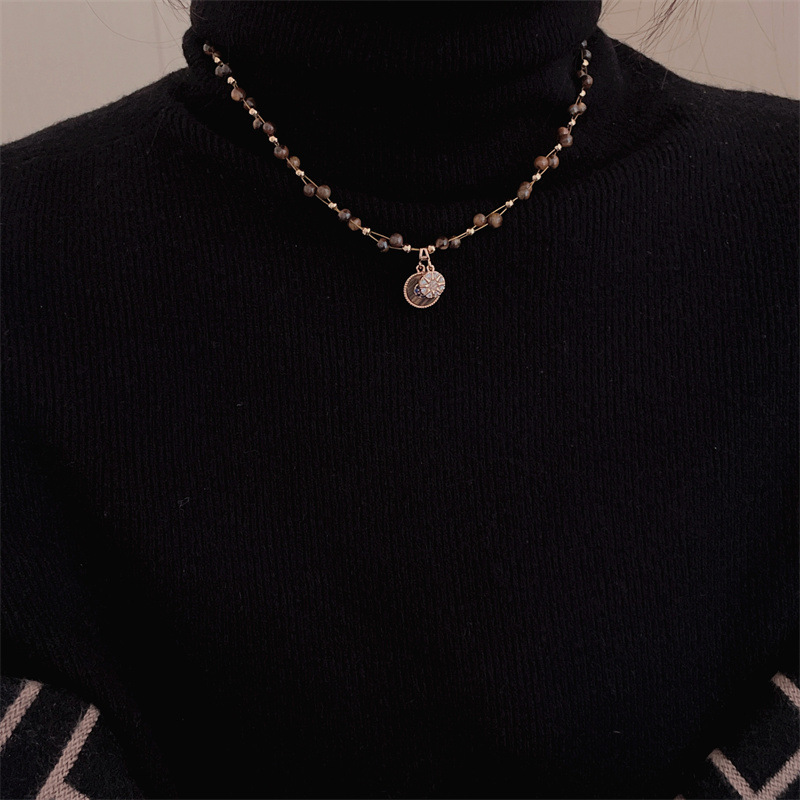 New Retro Tiger Eye Stone Beaded Eight-Pointed Star Disc Necklace Women's Light Luxury High-End Maillard Niche Clavicle Chain