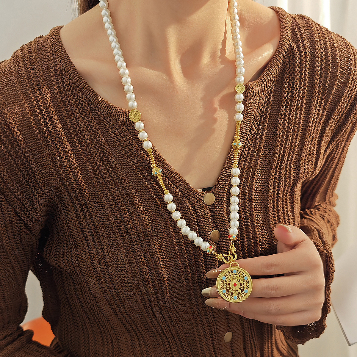 Chinese-Style Disc Badge Multi-Treasure Necklace Ethnic Pearl Sweater Chain New Chinese-Style Long Palace-Style Hanfu Accessory