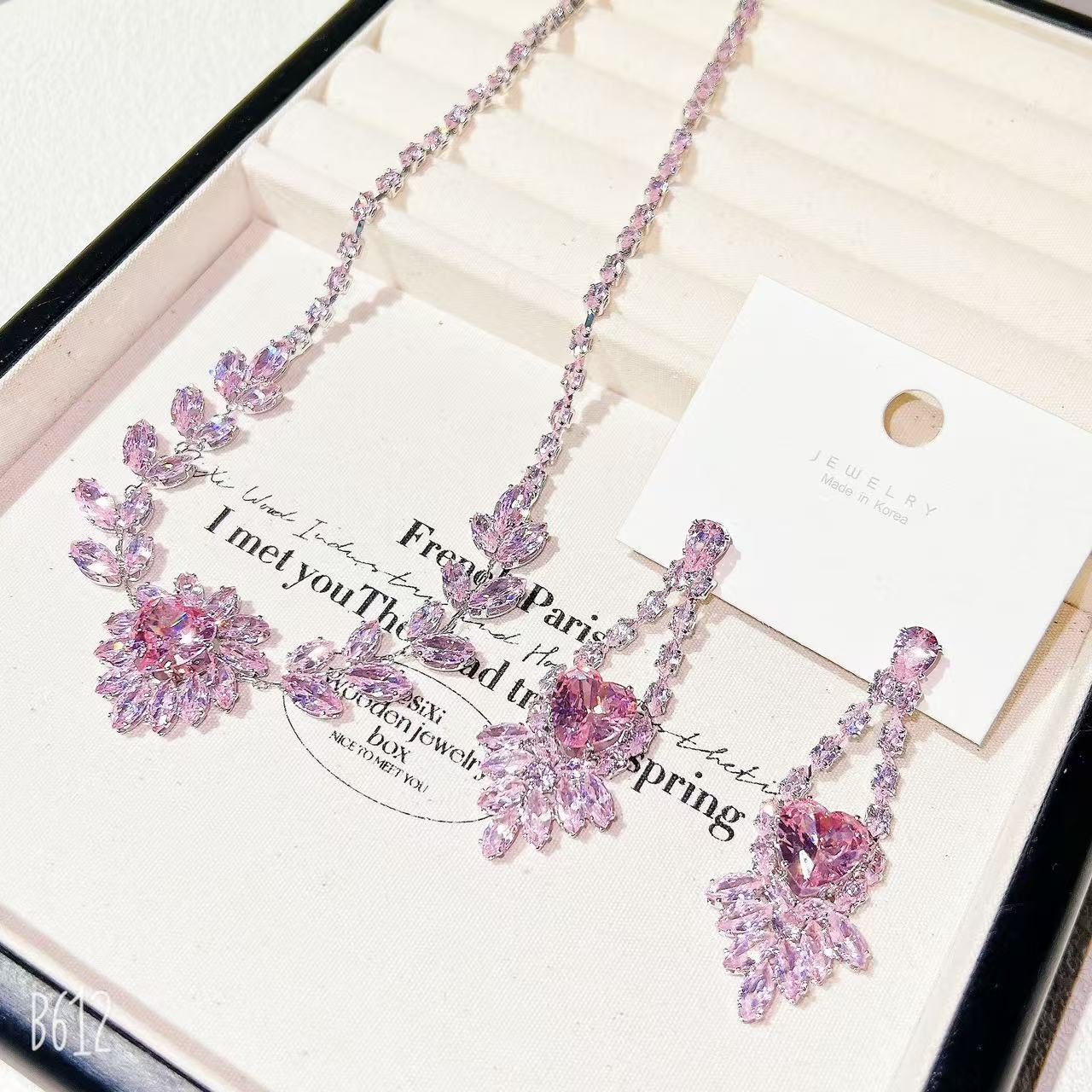 Light Luxury High Quality Full Diamond Crystal Zircon Pink Love Pendant Heavy Industry Design Necklace Silver Needle Earrings suit