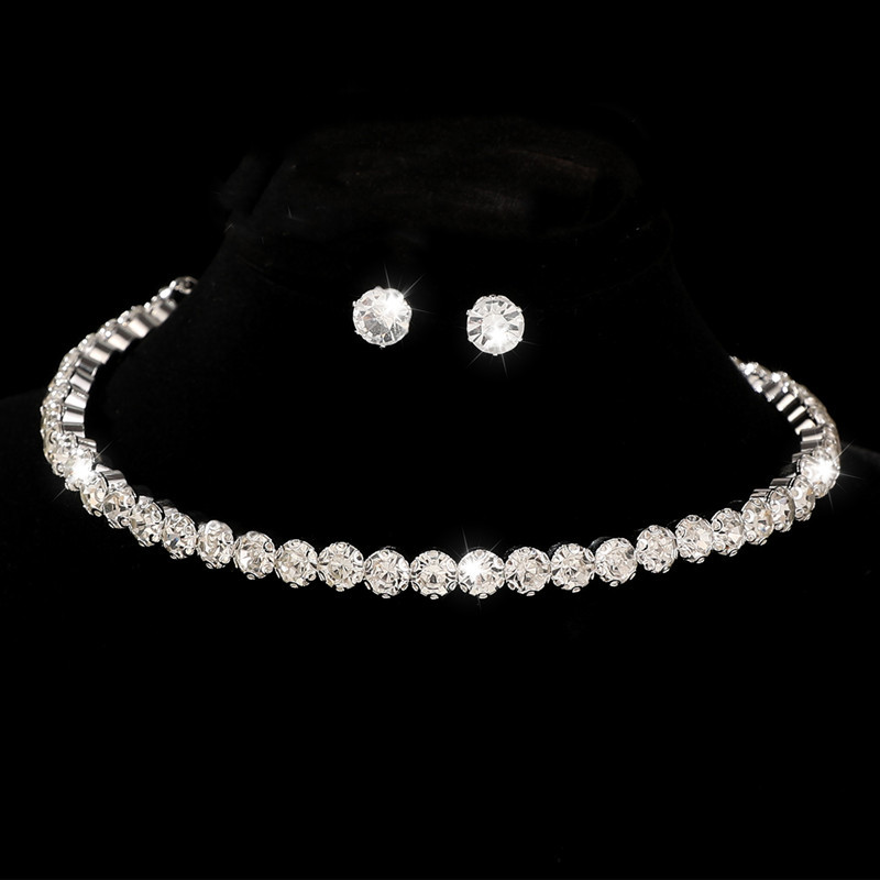 European and American Cross-border Fashion Single Row Flash Diamond Collar Necklace Earrings Two-piece Bride Shining Rhinestone Jewelry Set