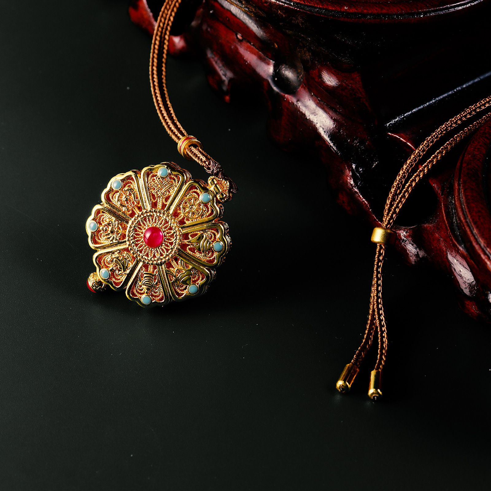 Same Hollow Eight Treasure Compasses Pendant Shajin Gawu Box Necklace New Chinese Sakyamuni Disc Woolen Chain for Women