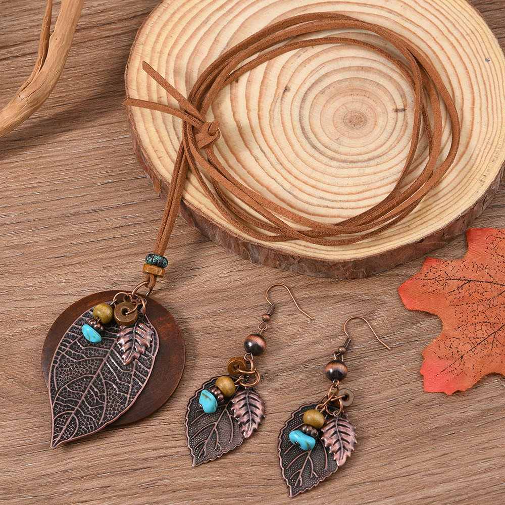 Cross-border New European and American Retro Style Iron Leaf Wooden Disc Handmade Women's suit Earrings Necklace