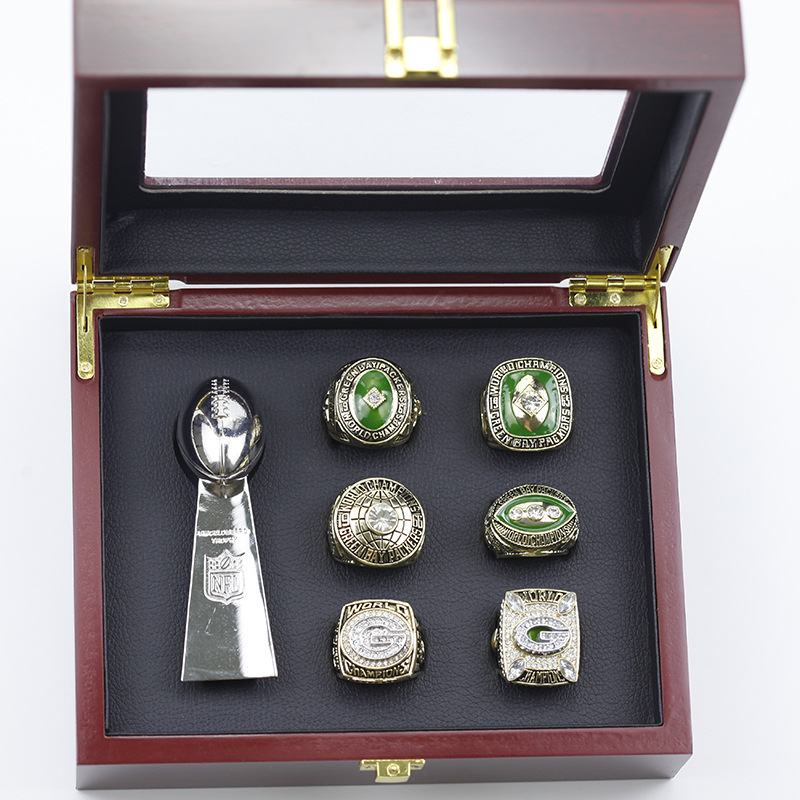 6 Green Bay Packers NFL championship rings Super Bowl trophy set