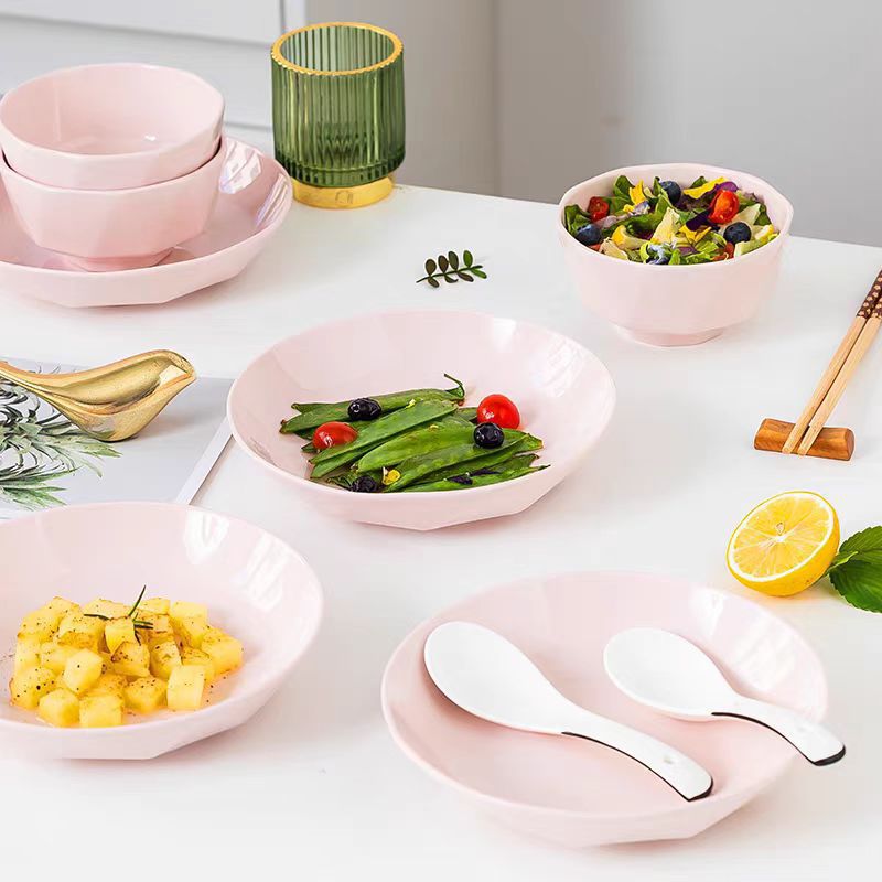 Scandinavian Pink Accessible Luxury Tableware Diamond Bowl and Plate Set Household Ceramic Rice Bowl Dish Plate Soup Plate Microwaveable
