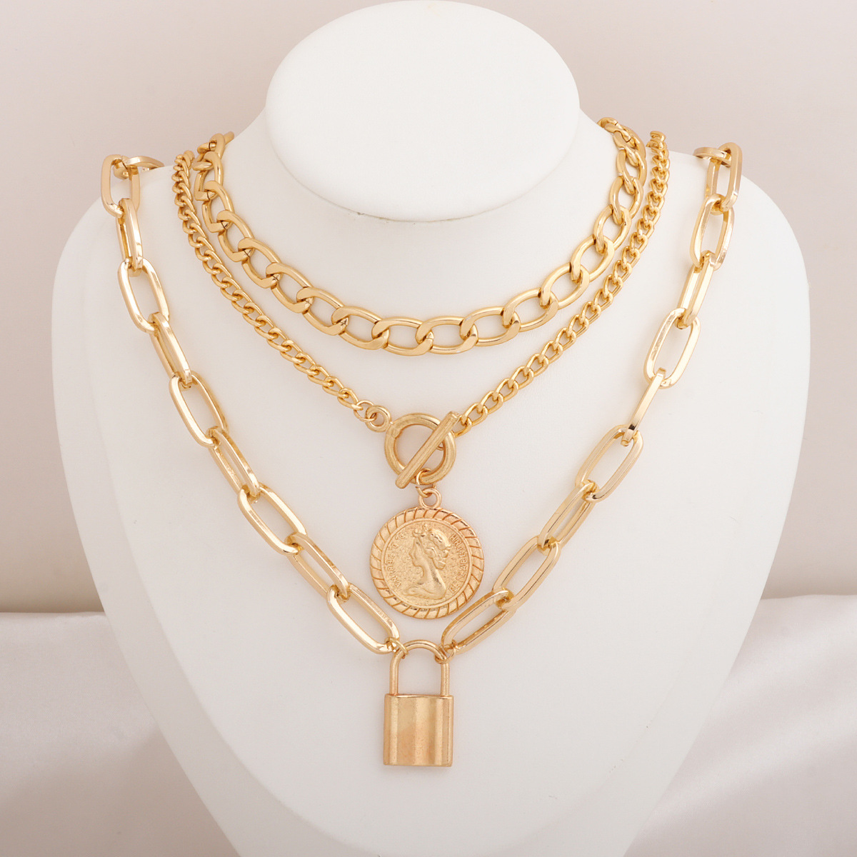 European and American Cross-Border New Fashion Simple Necklace Set Ot Buckle Embossed Disc Lock Pendant Retro Cuban Necklace Jewelry