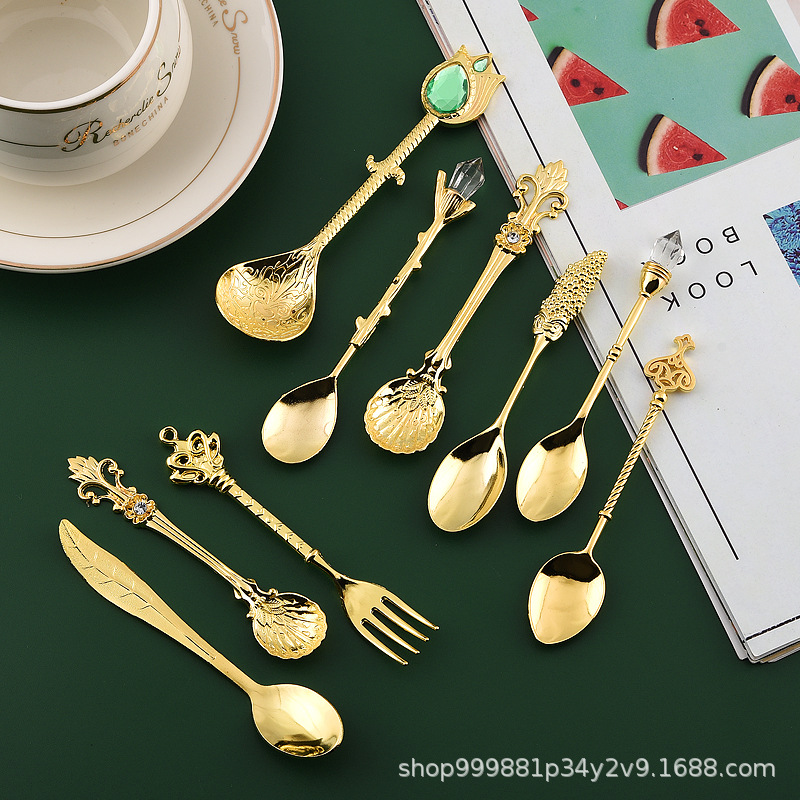 European retro coffee mixing spoon wholesale afternoon tea dessert spoon Golden pattern Diamond zinc alloy fork spoon set